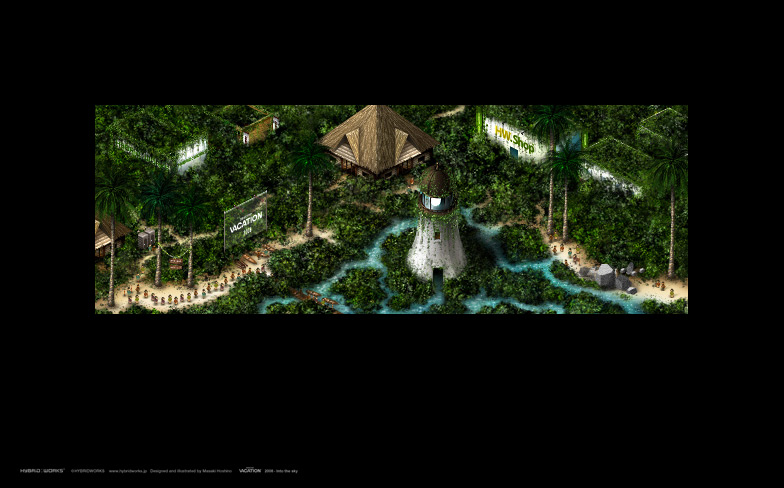“Desktop Vacation 2008: Into the Sky” is viewer-oriented content that lets PC users enjoy a vacation while sitting at their desks. The series started in 2004 (Image1, Image2), and a more detailed second part was released in 2006 (Image1, Image2). In the third version released in 2008, you can look down on a cloud-covered island from the sky. This island exists only on the desktop, for which all of the island details and clouds have been created.